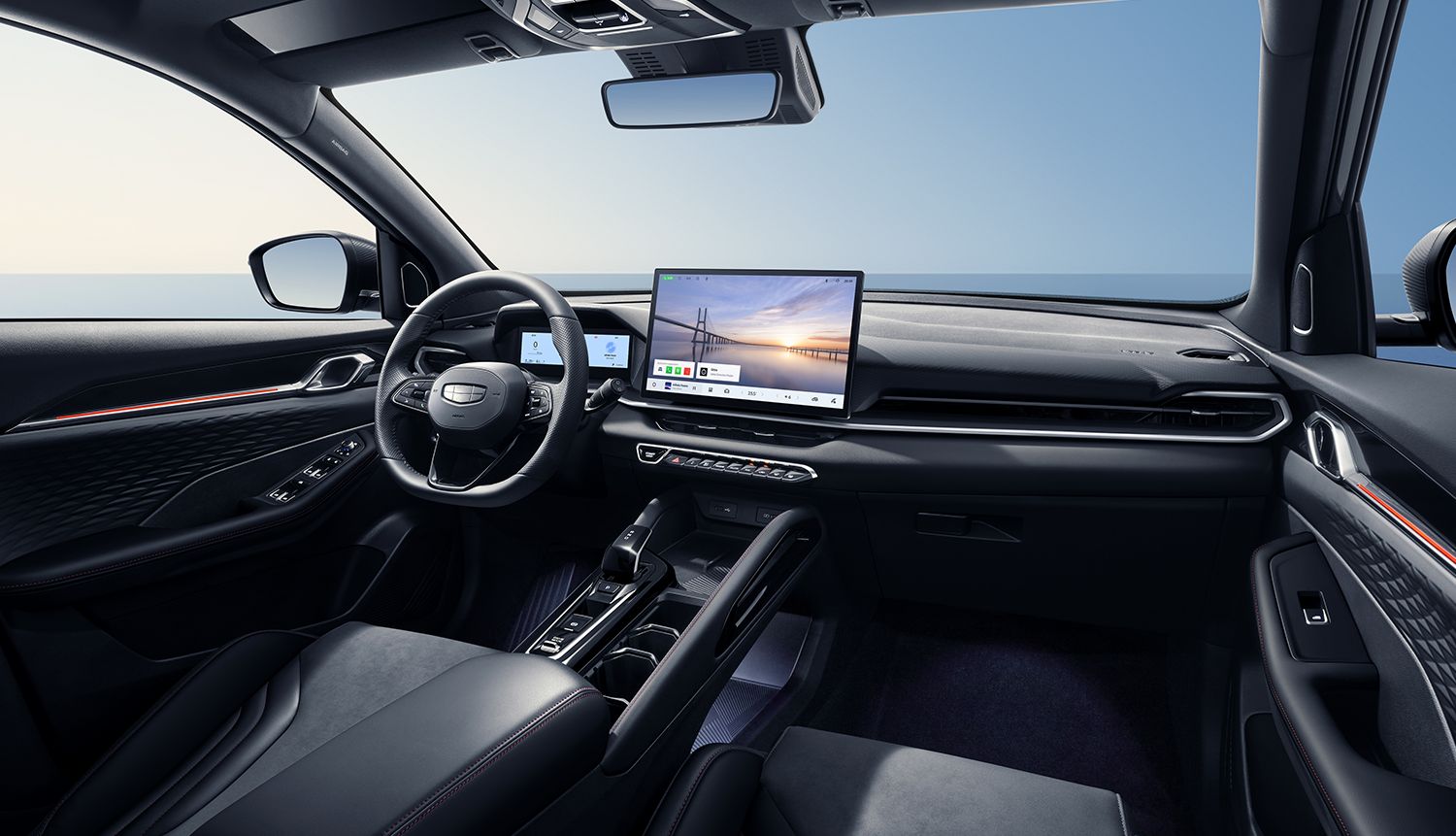 La SUV New Coolray ofrece un interior moderno y tecnológico. Cuenta con una pantalla táctil central de 14.6” y un panel de instrumentos digital de 8.8” que brindan una experiencia conectada y funcional. Su selector electrónico de cambios y el volante multifunción forrado en eco cuero aportan comodidad y estilo, mientras que los diferentes modos de conducción permiten adaptar el manejo a cada situación.